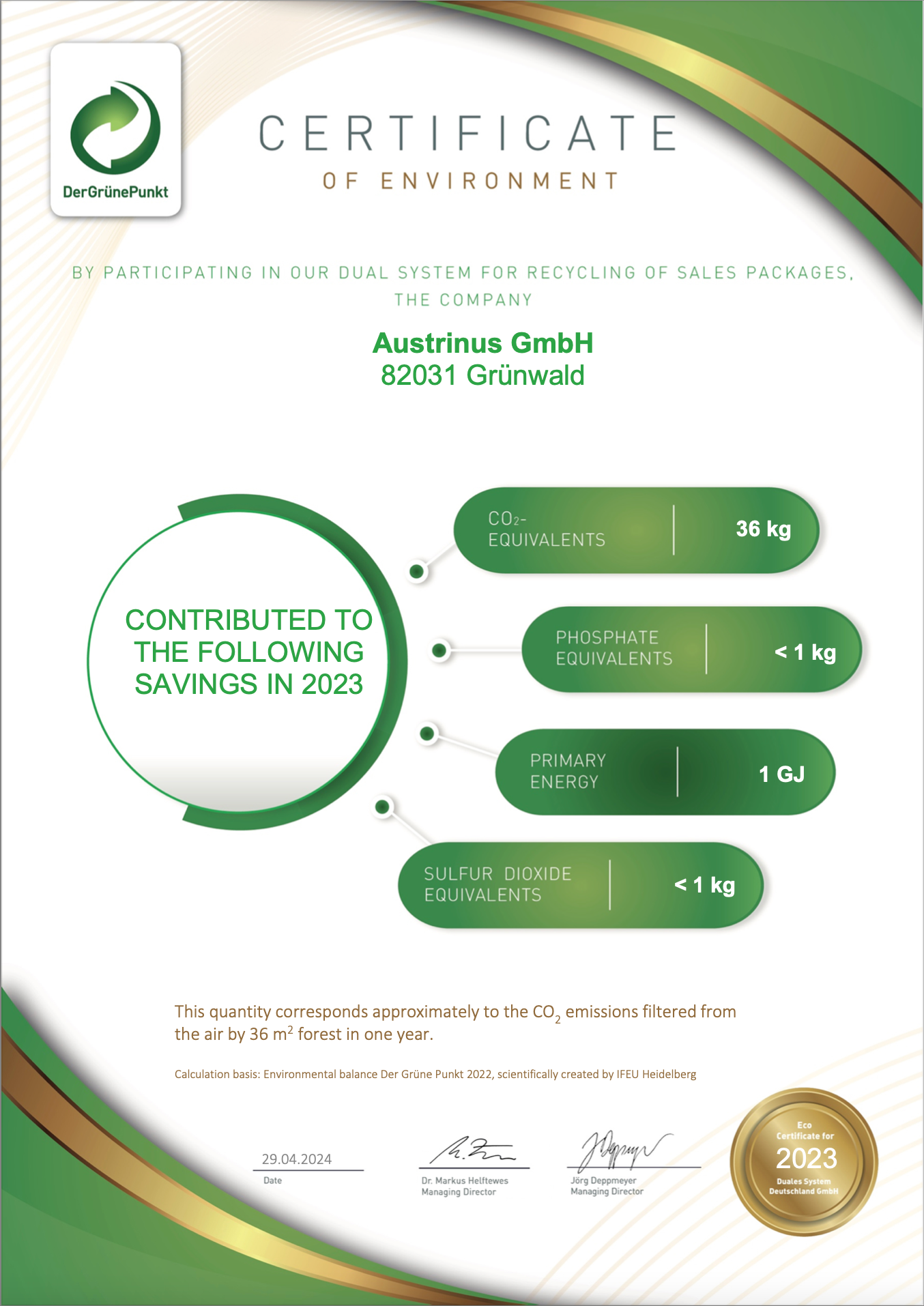 Wir bei CentroVit® sind uns unserer ökologischen Verantwortung bewusst. Durch unsere nachhaltigen Praktiken haben wir im Jahr 2023 maßgeblich zur Reduktion von CO2-Emissionen beigetragen. Laut der Umweltbilanz von "Der Grüne Punkt" und wissenschaftlichen Berechnungen des IFEU Heidelberg, entspricht unser Beitrag der Menge an CO2, die von 36 m² Wald in einem Jahr aus der Luft gefiltert wird. Dieses Engagement unterstreicht unsere Verpflichtung zur Nachhaltigkeit und zum Umweltschutz.